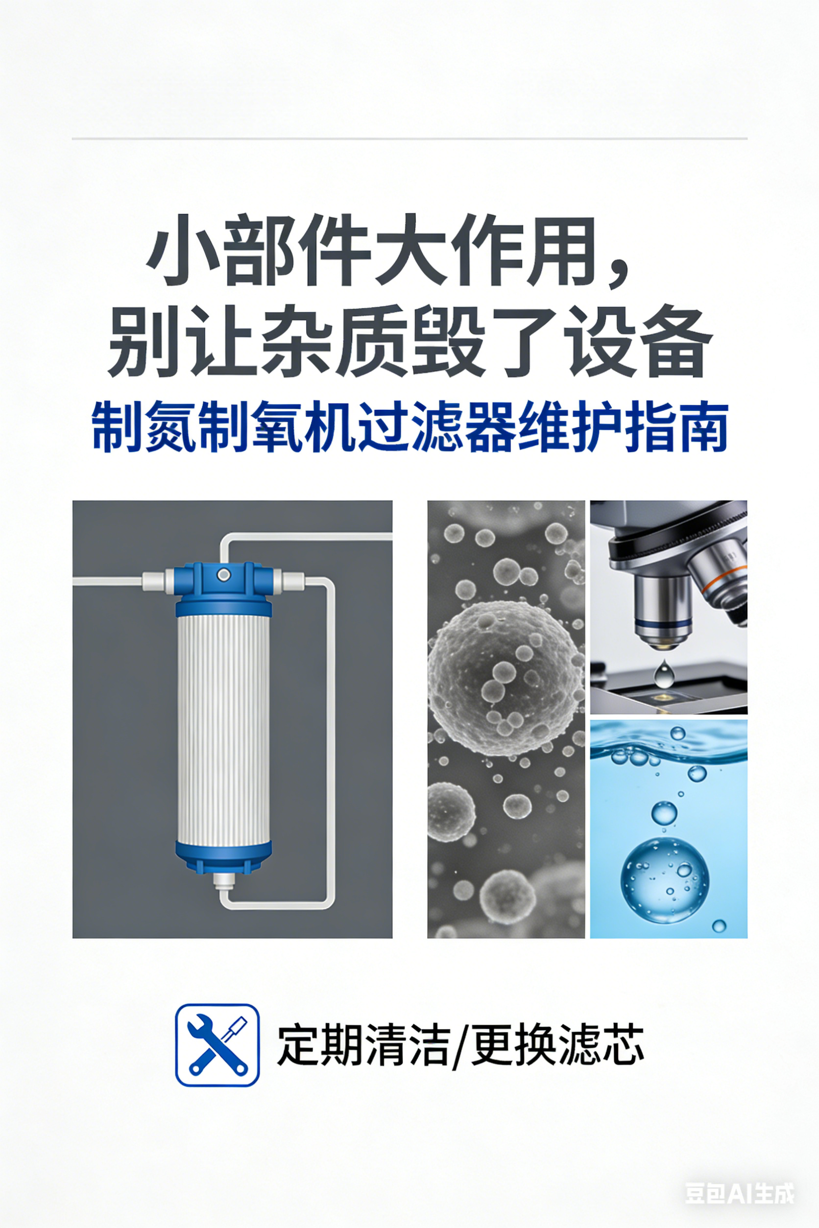 在制氮机、制氧机的运行系统中,过滤器是容易被忽视却至关重要的小部件。它就像设备的“呼吸系统”,负责过滤进气中的粉尘、油污、水分等杂质,保护吸附剂、压缩机、阀门等核心部件免受损坏,确保设备稳定运行和气体纯度达标。然而,很多工厂由于忽视过滤器的维护,导致过滤器堵塞、失效,进而引发设备故障,增加运维成本。今天,我们就来详细分享制氮制氧机过滤器的维护指南,帮助大家重视小部件,保障设备大安全。一、过滤器的核心作用:守护设备的“第一道防线”制氮机、制氧机的进气多为空气,空气中含有大量的粉尘、水分、油污等杂质